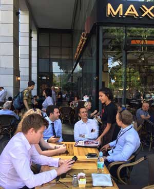 At Max Brenner in Sarona. Ambassador Sharma with folded arms. Photo: Facebook