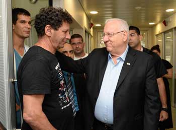 While visiting the intensive care unit of the neurosurgery department at the hospital, accompanied by hospital director Prof. Roni Gamzu, the President met Assaf Bar who had a gunshot wound to the head. The President embraced his family, and held Assaf’s hand. “I am pleased to be here with you, we were worried that your injury was even more serious still, but here you are talking with me, and it is wonderful,” said the President and added, “you will enjoy many more happy and good times, we cannot let them get the better of us. I am going now to where you were injured yesterday. We will continue with our lives.”