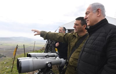 Israeli Prime Minister Benjamin Netanyahu and Security Cabinet members get a tour with the North Front Command in the Golan Heights, on Feb. 6, 2018. Credit: Kobi Gideon/GPO.