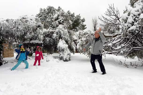 President Reuven Rivlin has a new fight on his hands…snowball at ten paces with grandchildren Karni and Ziv. Photo Haim Zach/GPO