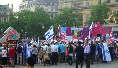 An unofficial tribute to the Israeli Olympians murdered at the 1972 Olympics in July 2012 in London’s Trafalgar Square, coinciding with the start of that year’s Summer Olympics in London. That year, the International Olympic Committee declined to grant requests for an official moment of silence for the Munich victims during the Olympics that marked the 40th anniversary of their deaths. Credit: Chesdovi via Wikimedia Commons.