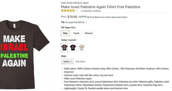 A screenshot of the “Make Israel Palestine Again” t-shirt that was being sold on Amazon. Credit: Screenshot.