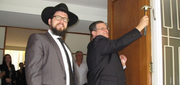 Rabbi Shmueli Feldman stands by as Ambassador Shmuel Ben-Shmuel attaches a mezuzah Photo: Sylvia Deutsch