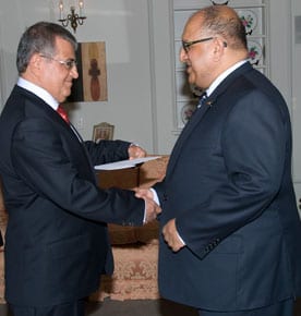 Shemi Tzur l. presents his credentials to Governor-General Sir Anand Satayanand