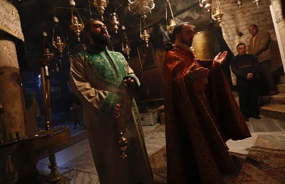 Christian clergymen pray inside the Church of Nativity, in the city of Bethlehem, a few days before the Christmas holiday. December 23, 2018. Credit: Wisam Hashlamoun/FLASH90