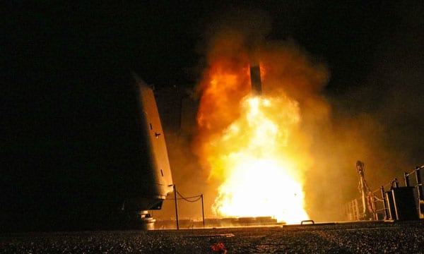 The guided missile cruiser USS Monterey fires a Tomahawk missile in the U.S. 5th Fleet area of operations, April 14, 2018.