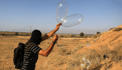 Palestinians in Gaza attach a balloon to flammable materials to be flown towards Israel. These incendiary devices have caused destruction to trees, animals, the land and the environment. June 17, 2018. Photo by Abed Rahim Khatib/Flash90.