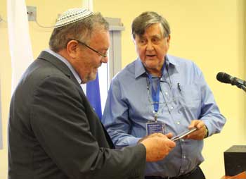 David Irvine , Chairman of the Australian Cyber Security Research Institute, presents a gift to Bar-Ilan University President Rabbi Prof. Daniel Hershkowitz