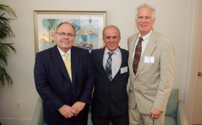 Consul General of Israel in New York Dani Dayan, the Weizmann Institute’s Prof. Yosef Yarden and Israel Cancer Research Fund President Rob Densen at the consul general’s residence. Credit: Perry Bindelglass.