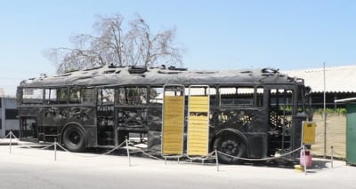 The remains of the Israeli bus hijacked by Palestinian terrorists in 1978 in an attack masterminded by terrorist Dalal Mughrabi. After Palestinian Media Watch recently notified Belgium that a Palestinian Authority school it had funded was renamed for Mughrabi, the Belgian Foreign Ministry said the country “will put on hold any projects related to the construction or equipment of Palestinian schools.” Credit: MathKnight via Wikimedia Commons.