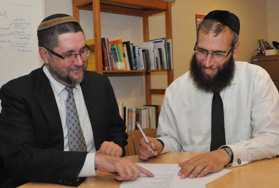 Ari Heber and Rabbi Mendel Kastel check out the agreement pic: Henry Benjamin
