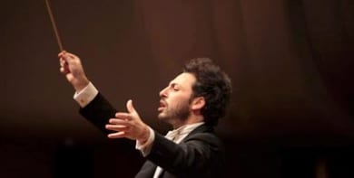 Goldstein looks every part the young conductor: lean, with a profuse tangle of black hair above a stubble, and a striking, mobile face that partners his gestures. His mannerisms are passionately Italian and Jewish at the same time. That’s part of his rarity. He’s double-barreled when it comes to culture. His interests roam way outside music, too. As well as being a conservatorium graduate in piano and conducting, he holds a PhD in aesthetics.