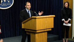 Deputy National Security Adviser Ben Rhodes, who constructed the Obama administration’s communications strategy around the Iran nuclear deal, addresses the media in January 2014. President Barack Obama, in the final days of his administration, appointed Rhodes to the council of the U.S. Holocaust Memorial Museum. Credit: U.S. State Department.