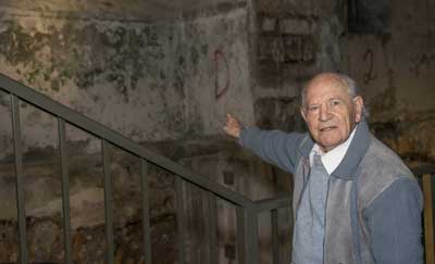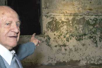 Shmuel Matza, now 89, points to his carvings in the interior wall of Jerusalem’s Kishle prison decades earlier. Credit: Maayan Jaffe-Hoffman.