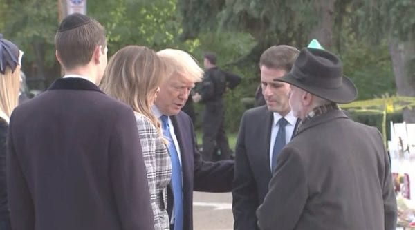 Accompanied by Tree of Life Synagogue’s Rabbi Jeffrey Myers – who reportedly received hate mail for saying he would welcome Trump – the president and first lady visited the memorials outside the synagogue and lit a candle inside the building for each of the victims.