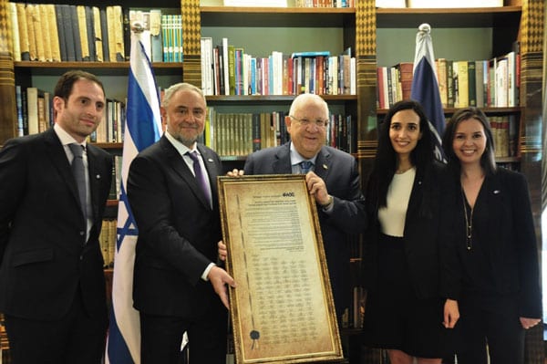 The declaration, designed in the format of Israel’s original Declaration of Independence, was delivered to Israeli President Reuven Rivlin by a World Jewish Congress delegation led by WJC CEO Robert Singer and representatives of the WJC’s flagship program, the WJC-Jewish Diplomatic Corps – the future leaders of Jewish communities worldwide.
