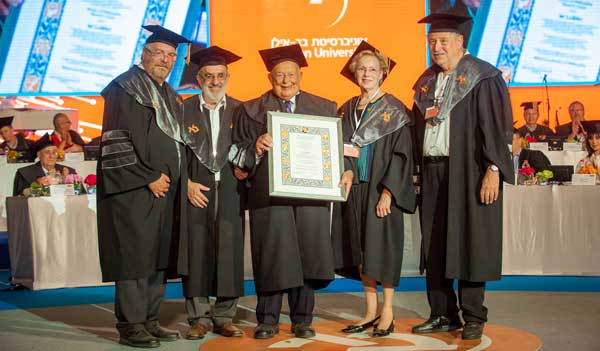 Isi Leibler (center) with (from left to right) Bar-Ilan University President Rabbi Prof. Daniel Hershkowitz, former Soviet Prisoner of Zion Dr. Ari Volvovsky, Mrs. Naomi Leibler, and Internet Entrepreneur Dr. Yossi Vardi upon receiving an honorary doctorate from Bar-Ilan University Photo: Chen Damari