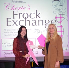 Niamh Brady (National Breast Cancer Foundation) receives a cheque from Esti Lipson The funds were raised through the school's clothes shopping extravaganza, Cherie’s Frock Exchange.