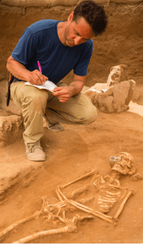 Cemetery excavation supervisor Adam Aja examines a 10th-9th century BC burial during the excavation of the Philistine cemetery by the Leon Levy Expedition to Ashkelon