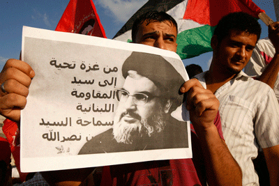 During a September 2014 protest in Gaza against American and French military intervention in Syria, a Palestinian man holds a picture of Hassan Nasrallah, head of the Iranian-backed Lebanese terror group Hezbollah. Many critics of the recently reached nuclear deal fear that sanctions relief will help Iran increasingly fund terror groups like Hezbollah, Hamas, and Islamic Jihad. Credit: Abed Rahim Khatib/Flash 90.