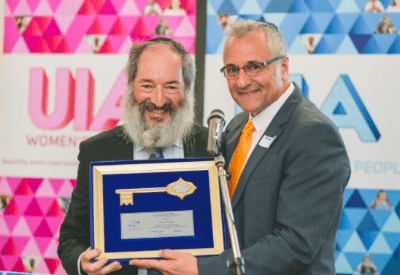 Director General of Keren Hayesod Greg Masel presenting Shlomo Werdiger with The Key to Jerusalem Award.