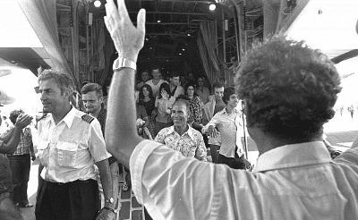 Israeli Foreign Minister Yigal Allon (back to camera) welcoming the rescued Air France passengers and crew, including pilot Michel Bacos (left), coming off an Israel Air Force Hercules plane at Ben-Gurion International Airport, July 1976. Credit: Moshe Milner/Israel Government Press Office.
