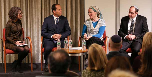 The Forward newspaper Editor-in-Chief Jane Eisner, Jerusalem Mayor Nir Barkat, Racheli Frenkel (mother of murdered Israeli teenager Naftali Frenkel), and Ofir Shaar (father of murdered Israeli teenager Gilad Shaar) at a recent event hosted by the UJA-Federation of New York. The event celebrated the launching of the Jerusalem Unity Prize, which was established by the families of the three Israeli teens murdered by Hamas last summer, the Jerusalem municipality, and the Jerusalem-based organization Gesher. Credit: UJA-Federation of New York.