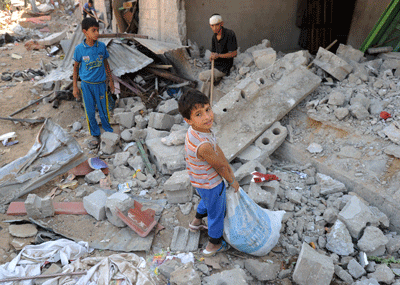 Palestinian youths search through rubble in the Gaza Strip in August 2014, during that summer’s war between Israel and the Gaza-ruling Hamas terror group. Credit: UN Photo/Shareef Sarhan.