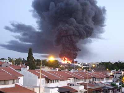 A burning factory in the southern Israeli city of Sderot that was hit by a rocket fired from Hamas-controlled Gaza on June 28, 2014. Credit: Natan Flayer via Wikimedia Commons.