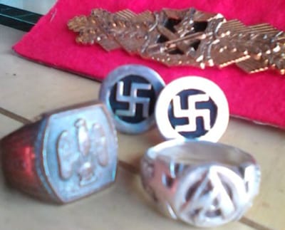 Adolf Hitler coins, swastika rings, swords and Hitler Youth badges are some of the items listed, with many on sale for up to $2000.