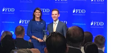 U.S. Ambassador to the United Nations Nikki Haley accepts the Jeane J. Kirkpatrick Statesmanship Award from the Foundation for Defense of Democracies at its annual National Security Summit on Aug. 28, 2018. (Credit: Jackson Richman/JNS)