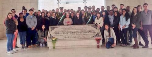 Harvard University students pose at Yasser Arafat’s grave on a recent trip called “Israel Trek” that was sponsored by Harvard Hillel and Combined Jewish Philanthropies of Boston. Credit: Twitter.