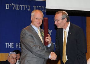 Leon Kempler, left, received his Fellowship from Hebrew University President Menahem ben-Sasson Pic: Douglas Guthrie