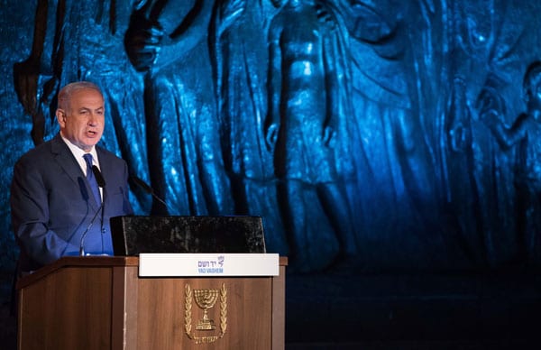 Israeli Prime Minister Benjamin Netanyahu speaks at the official state ceremony held at the Yad Vashem Holocaust Memorial Museum in Jerusalem, as Israel marks annual Holocaust Remembrance Day. April 11, 2018. Credit: Yonatan Sindel/Flash90