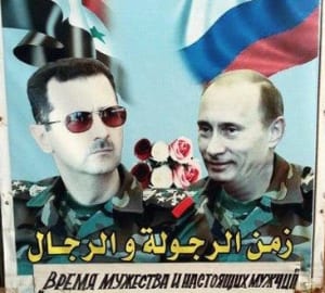 Bashar al-Assad (l) and Vladimir Putin (r); the legend says in Arabic and Russian, “The time of masculinity and men.”