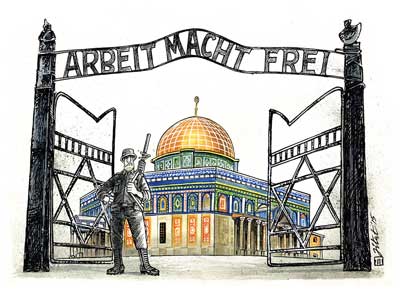 Not enough? There’s more. The gates of Auschwitz, adorned with the deadly motto “Arbeit Macht Frei,” swing open to reveal the Al-Aqsa mosque, which sits on Jerusalem’s Temple Mount. Israeli Prime Minister Benjamin Netanyahu, devils’ horns jutting from his forehead, gives a Nazi salute; instead of his usual business suit, he wears a bloodstained brown uniform, with a Star of David rendered as a swastika decorating the sleeve.
