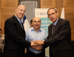 Chairman of The Jewish Agency for Israel, Natan Sharansky with the co-Chairmen of the Lobby for Strengthening the Jewish People, MK Dr Nachman Shai and MK Tzachi Hanegbi at the launch of the lobby (Photo credit: Sasson Tiram)