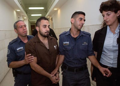 Khalil Adel Khalil (second from left), 25, of the A-Tur neighborhood in Jerusalem, is brought to Jerusalem’s District Court on July 9, 2015. Khalil, who admitted to trying to join the Islamic State terror group in Syria, was sentenced to two years in prison. Credit: Yonatan Sindel/Flash90.