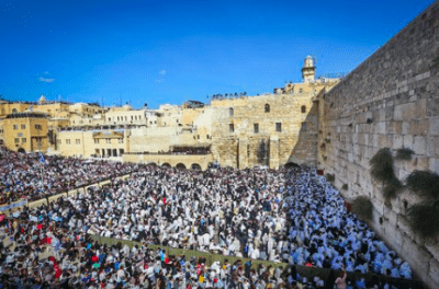Jewish worshippers pack the area in front of Jerusalem’s Western Wall for the birkat kohanim (priestly blessing) during the holiday of Sukkot on Oct. 8, 2017. Current trends in Jewish and Arab demography defy predictions of “doom” for Israel’s Jewish population, demographic expert Yoram Ettinger says. Credit: Yaakov Lederman/Flash90