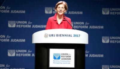 Sen. Elizabeth Warren (D-Mass.) speaks at the Union for Reform Judaism’s (URJ) biennial convention in Boston on Dec. 8. Credit: URJ via Facebook.