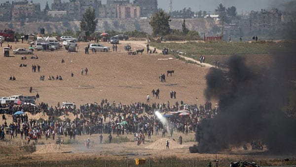 Palestinian protesters attempt to blind Israel Defense Forces with mirrors, as they demonstrate and burn tires near the border with Israel in the Gaza Strip, as seen from the Israeli side of the border on April 6, 2018. Credit: Hadas Parush/Flash90