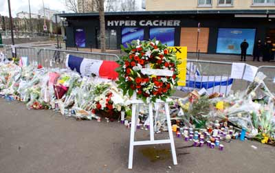 The wreath left outside the Hyper Cacher kosher supermarket in Paris by U.S. Secretary of State John Kerry and French Foreign Minister Laurent Fabius on Jan. 16, to pay homage to the Jewish victims of the Jan. 9 terrorist attack at that site. Credit: U.S. Department of State.