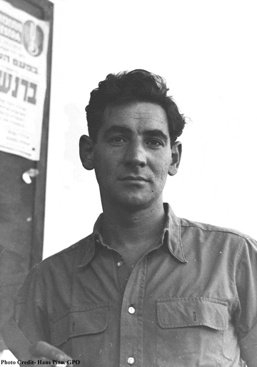 Conductor Leonard Bernstein under a poster announcing his concert with the Israeli Philharmonic Orchestra. Photo by Pinn Hans/GPO