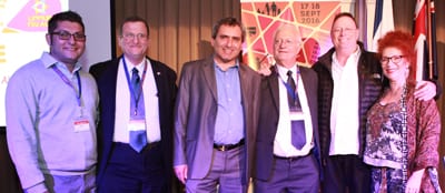 Executive Director Roman Kogan; Israeli Ambassador to Australia Shmuel Ben Shmuel; Israeli Minister of Environmental Protection Zeev Elkin; Limmud FSU Founder Chaim Chesler; Zionist Federation of Australia President Emeritus Ron Weiser; and jazz singer Fay Sussman at the gala opening of Limmud FSU Australia.