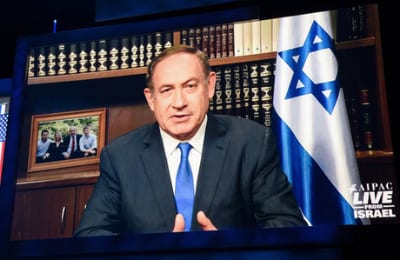 Prime Minister Benjamin Netanyahu, pictured here addressing the 2017 AIPAC policy conference via satellite, said the common dangers faced by Israel and its Arab neighbors present a “rare opportunity” to build a more peaceful future in the Middle East. Credit: AIPAC.