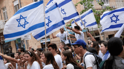 Highschool students from Yavne celebrate on the streets of central Jerusalem before the flag march of Jerusalem Day, on May 13, 2018. Photo by Nati Shohat/Flash90.