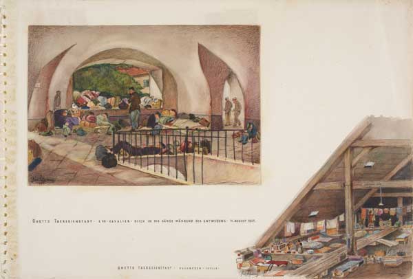 Paul Schwarz captured the intimate world of the housing barracks, secluded nooks, and little courtyards of the ghetto in almost idyllic watercolours. Leo Lowit’s unflinching material is stark and unforgiving, and sometimes ironic, in its depiction of the horror, fear and desolation in Theresienstadt.