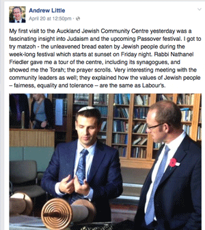 Labour leader Andrew Little visited Auckland’s Jewish Community centre this week and after he posted about it on his Facebook page several hateful, bigoted posts were made.