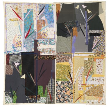 Created with pieces of uncut cloth – anything from kaffiyahs to uniform remnants – the elaborate compositions were stitched together by Eshkol’s dancers. Variously layered, folded, or collaged, she never used scissors to alter her source material, leaving much to chance and to the mood of any particular given day. While eventually resuming her work in dance, Eshkol continued making Wall Carpets, passionately and prolifically, for the rest of her life. It has been debated whether the artist saw any parallels between her work in movement and in textile, and yet in different ways, both reflect her interest in the laws of geometry and kinetics, alongside the rootedness of her practice in the rituals of collaborative activity. Ranging from the figurative to the abstract, Eshkol’s unusual tapestries cast new light on a unique relationship between choreography and visual art.