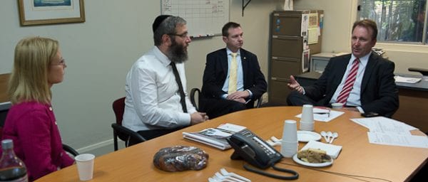 Gabrielle Upton, Rabbi Mendel Kastel and Bruce Notley-Smith talk with NSW Mental Health Minister Kevin Humphreys